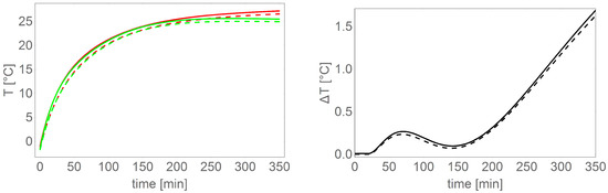 Left chart shows comparison of BLDC motor heating curves ( dashed line, solid line) for two control variants: sensors in the motor (red), external magnetic disc (green), right chart shows differences between the heating temperatures shown on the left figure.
