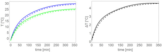 Left chart shows comparison of BLDC motor heating curves controlled based on an external sensor ( dashed line, solid line) for two power supply variants: power supply without DC/DC converter (blue color), power supply via DC/DC converter (green), right chart shows differences between the heating temperature shown in the left picture.