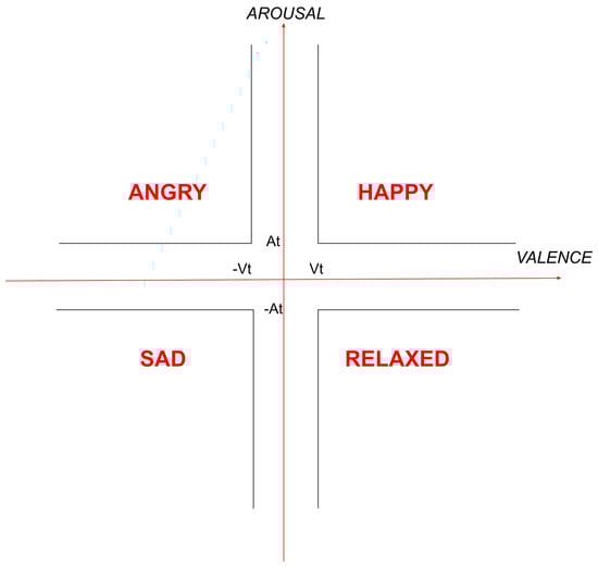 According to [18], the first process for creating this dataset is related to lyrics collection. Later, each word in lyrics is attributed to a pair with values of valence and arousal. The set of values for each word is computed with the help of three dictionaries which contain emotional information, ANEW (Affective Norms of English Words) [38], WordNet [39] and WordNet-Affect [40]. Subsequently, for each song a general pair of values of valence and arousal is computed by the individual values of the words that make up the lyrics of the song. Finally, each song is addressed to one mood label by discriminating each song to one of four mood classes, according to Table 2.