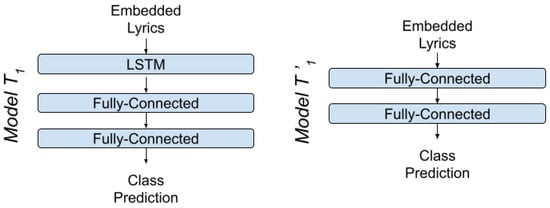 For lyric analysis we use three different architecture approaches, one Fully-Connected Neural Network (), one Recurrent Neural Network () with LSTM cells [43] and one pretrained Network () that utilizes Transformers, also known as BERT (Bidirectional Encoder Representations from Transformers) [44]. For each architecture we use different word embedding methods: for the Fully-Connected Network we use Bag of Words and TF-IDF embeddings, for the LSTM Network, which utilizes the words’ order of appearance, we use Word2Vec and GloVe embeddings and for BERT we use BERT embeddings.