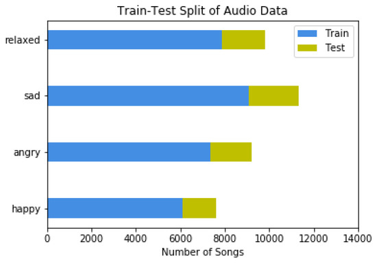 In order to apply dataset augmentation to the audio signal data, we divided audio files in 10 s clips and the result was 37,989 audio clips with 10 s duration. Alongside the fragmentation of audio files, downsampling of audio signals were applied, the sampling rate of audio decreased to 22,050 Hz from 44,100 Hz. We observed that a high sampling rate does not play an important role in mood detection, but its decrease helped significantly with the dimensional reduction of the input data. The bitrate of the available songs varies from 96 kbps to 256 kbps, but that deviation does not have any important impact to our work since bitrate does not have an important effect on the evoked emotion. To create the audio dataset, we use string pairs (title, artist) to collect audio files from the web, in mp3 format and mono channel mode.