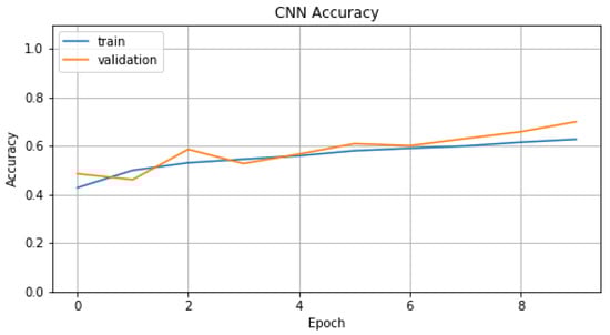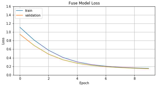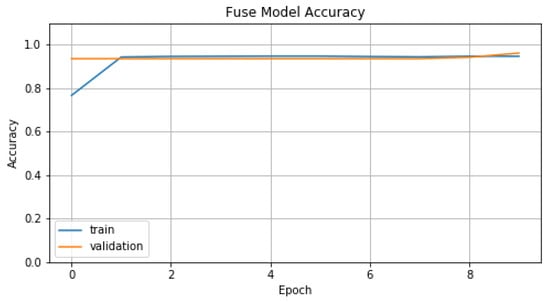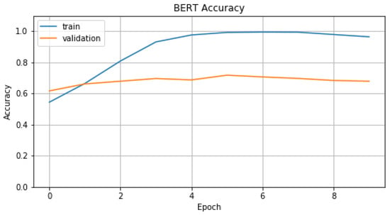 In the training process of model , we chose number of epochs equal to 10 and batch size equal to 16. For this process, we selected Adam as an optimizer with learning rate, beta and beta parameters set to 0.001, 0.9 and 0.999, respectively. In Figure 12 and Figure 13, we represent Accuracy and Loss values for training and validation data. Finally, in Table 5, we display the evaluation metric values that model achieves compared with models and . For , we chose the embedding method TF-IDF because it is the one with the best results.