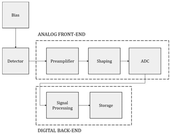 To gather and convert such signals, several approaches can be employed depending on the available hardware. In our application a peak detector (PKD) was used to temporarily store the amplitude of the voltage signals generated by the light pulses; the signals were then digitized by means of an analog-to-digital converter integrated into a low-cost microcontroller acting as a data acquisition unit. Before the PKD, some core components are commonly found, such as a preamplifier-shaper-discriminator chain that we implemented in a single custom-made printed circuit board (PCB). The system used to acquire, convert, and store the nuclear signals is called particle detection front end (PDFE), shown in Figure 1.