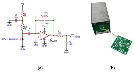 A dedicated PCB was designed for the charge sensitive amplifier (CSA) with a specified pulse height sensitivity of 0.67 mV∙pC−1 and a decay time of 15 μs (Figure 2). The board is powered by a single cell 3.7 V LiPo battery, greatly reducing the complexity of the circuit. The operational amplifier chosen (OPA365, from TI), was selected because of its high slew rate, relatively large bandwidth, rail to rail input-output characteristics (less than 10 mV from the rails), and negligible input bias currents.