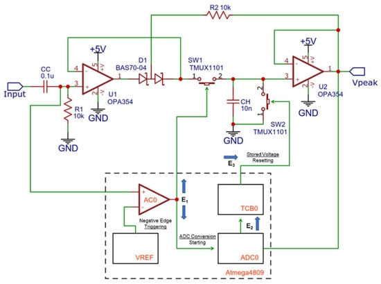 In our implementation, a MCA using a peak detection circuit built upon on a high-speed operational amplifier (OPA365/OPA354, from TI) [,] as a first stage input buffer was developed, as shown in Figure 3; the peak value is stored on a low leakage hold capacitor (CH) and can be reset through a single pole single throw switch (SW2, a TMUX1101 from TI) []. A second switch of the same model (SW1) is present on the input signal line of the circuit to grant a non paralysable behaviour to the acquisition system in case of very high counting rates. The logical operation of the circuit is managed by an Atmega4809 microcontroller (from Microchip) [].