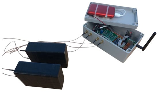 The prototype consisting of a data acquisition unit (DAQ) and all the described modules was designed, realized, tested, and applied in the field. The scheme and the actual prototype are shown in Figure 4.
