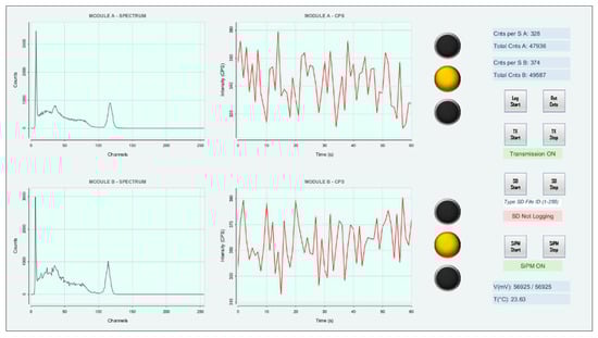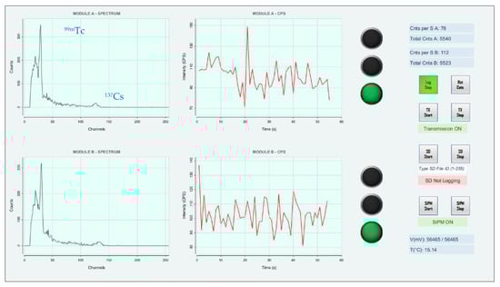 A basic graphical user interface (GUI) was designed to plot the RN spectra and counts per second (CPS) received by the RF receiving module (Figure 6). The GUI does not yet allow us to modify the parameters of the MCA, such as the gain or the calibration factors; it only allows us to check and save to specific log files the shapes of the received spectra and the trends of the CPS over time. A reset button was also implemented to reset the spectra when required. The goal is to add the required features to the next version of the GUI.