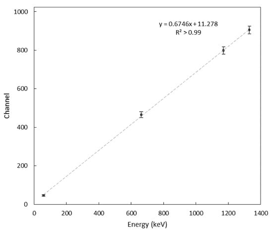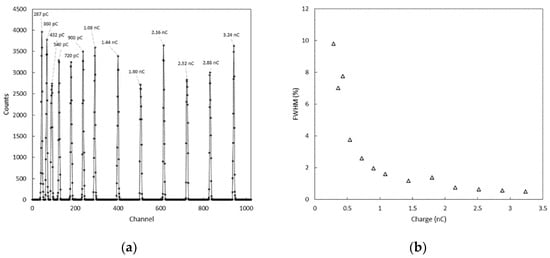 Results of the charge calibration of the CSA and MCA systems are shown in Figure 7 and Figure 8. The full width at half maximum (FWHM) of the distribution of the pulses can be used to estimate the noise associated with the conversion process. A FWHM of two channels, corresponding to about 5 mV, was found for all the test charges across the dynamic range, and a charge resolution (expressed as % FWHM) going from roughly 10% to less than 0.5% was estimated. Such values of charge resolution were considered adequate when the system is used to perform scintillation spectroscopy with a CsI(Tl) scintillation crystal, as a higher level of uncertainty can be expected from the processes of generation and collection of signal carriers [,]. The peak values of the distribution were also linearly fitted to the charges injected in the CSA, and the relative residuals to each fit are shown in Figure 8. The linear fit was appropriate for the present work; however, the response appears slightly non-linear toward low charge values. The non-linearity (NL), is defined as: