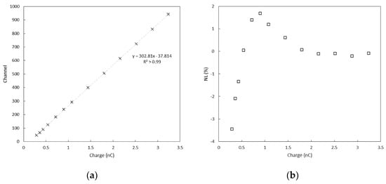 Results of charge calibration using a linear fit (a); relative residuals of the linear fit. The system shows less than 4% non-linearity through the dynamic range (b).