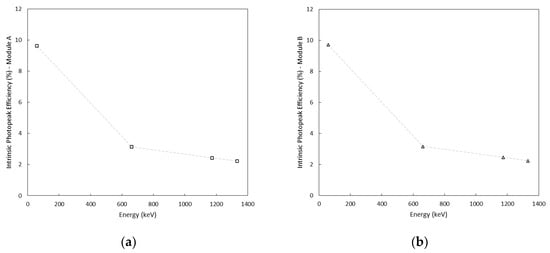 Intrinsic photopeak efficiency at different energies for module A (a) and module B (b).