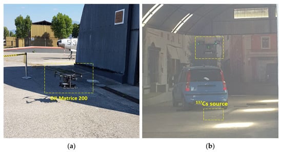 The behaviour of the radiation detection system mounted under a UAV—a DJI Matrice 200—was first tested through measurements conducted at the Joint NBC Defence School in Rieti (Italy), which provided a 500 MBq 137Cs radioactive source placed inside a hangar.