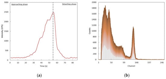Results of the in-flight testing of the detection system showing the curve corresponding to the detected activity during the (a) and the collected spectrum during the flight (b).