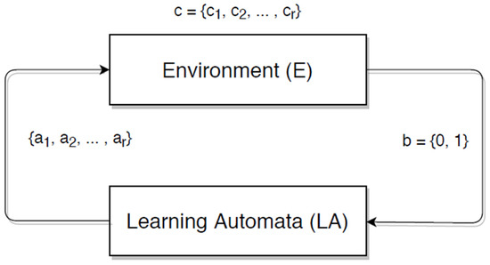 Learning automata are a machine learning paradigm. This is an abstract model that chooses the best action from a limited number of options and executes it in a complex environment. The environment then analyses the chosen action and reacts to the automaton using the reinforcement signal environment. To choose the next action, the automaton must first update its internal state from the previous action and then receive a signal. Thus, by following a set of rules, an automaton can discover the optimal output solution and interact with the environment in order to make the best choice for appropriate action, as shown in Figure 1.