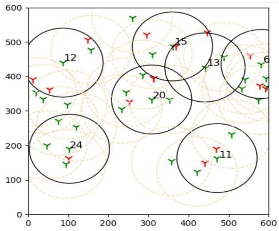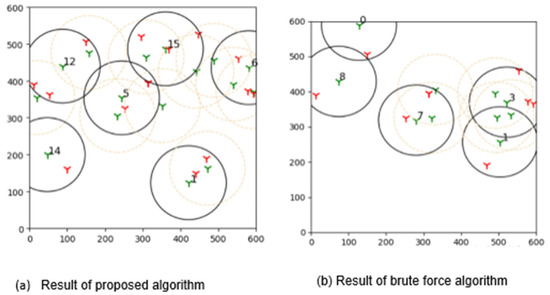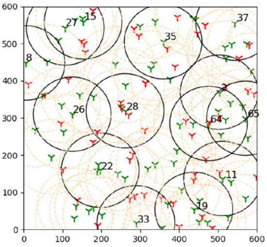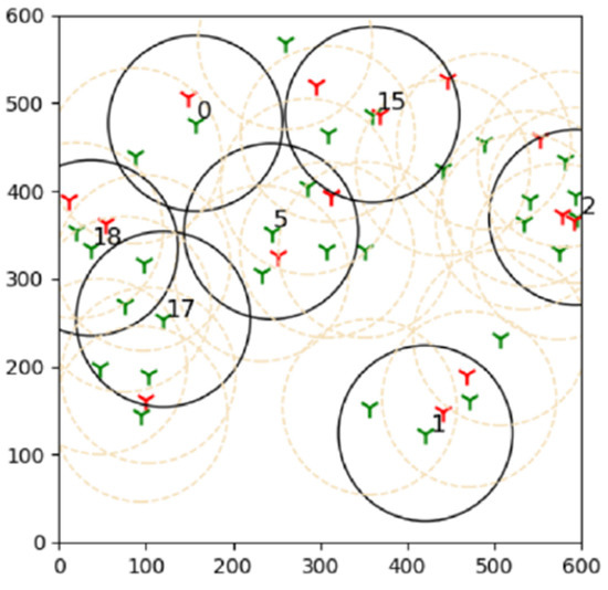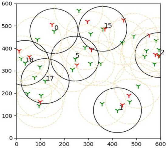 The outcomes of this experiment are shown in Figure 15. Green towers represent sensors, whereas red towers represent targets in the diagram. The number denotes the sensors that are covering the targets, and black circles represent their coverage. As a result of this outcome, it can be concluded that brute force is more effective than the suggested learning automata method in finding the best solution.