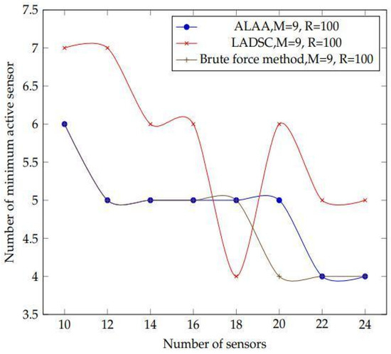 The plot shows results acquired by comparing the proposed adaptive learning automata algorithm (ALAA) to the learning automata disjoint coverage set (LADSC) algorithm and using the brute force approach to validate the results. There are nine targets in this experiment, with the sensor ranging from 9 to 25 and a sensing range of 100 m.
