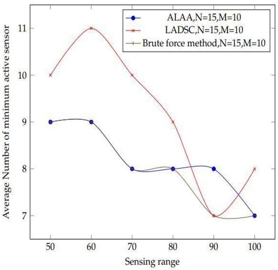 The plot shows results acquired by comparing the proposed adaptive learning automata algorithm (ALAA) to the learning automata disjoint coverage set (LADSC) Algorithm and using the brute force approach to validate the results. There are 15 sensors and 10 targets in this experiment, with sensing ranges ranging from 45 to 110 m.