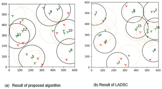 Figure 17 illustrates that when using the LADSC method, more sensors are required to cover all of the targets, whereas the suggested approach uses fewer active sensors. As a result of this finding, the suggested algorithm is capable of producing optimal outcomes.
