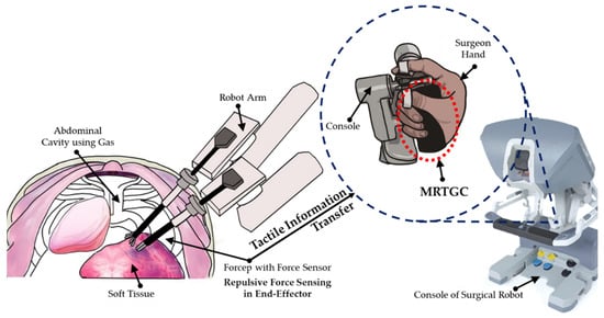 Schematic diagram of the overall control system integrated with the proposed MRTGC on the console of a surgical robot.
