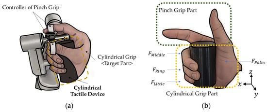 Cylindrical type tactile device combined with the pinch grip; (a) MRTGC integrated with the existing console, (b) free body diagram of the gripping motion.
