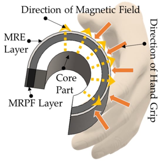Figure 3 shows the specific components of MRTGC with the directions of the handgrip and magnetic field. It is known that the behavior of MRF can be broadly divided into three types: flow, shear, and squeeze mode. In this study, the squeeze mode motion is dominant from the directions of the gripping and field generation. The stiffness of MRTGC mainly comes from the field-dependent yield stress of MRF soaked into the polyurethane foam (in short, MRPE), while the MRE layer is used as a cover since it is flexible and easy to seal for the leakage protection of MRF. The stiffness of the MRPF layer is also changed according to the formation of the magnetic field, and as a result, various tactile sensations can be delivered accordingly to the gripping hand (or fingers). Consequently, the primary materials to compose the shape of MRTGC shown in Figure 3 are as follows: MRF, MRE, and polyurethane foam.