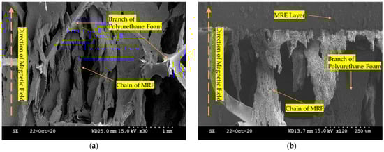 MRE is also one of the magnetorheological materials whose stiffness changes due to the interaction of CIP (Carbonyl Iron Particle) particles distributed between the rubber-like matrix according to the strength of the magnetic field. The strength of the magnetic field controls the stiffness of the MRE. However, to feel the change in the stiffness of MRE, effective results can only be seen when it is placed under high-frequency vibration. In this tactile design, MRE is used to help the formation of the chain-like structures by wrapping both MRF and polyurethane foam. Thus, the contribution of MRE to the stiffness change of MRTGC is small and hence neglected. Figure 6 presents the micro-structure interacting among the MRE layer, MRF, and polyurethane foam under the magnetic field. The polyurethane foam is adopted as a structure that can help form the chain of MRF. This foam can be manufactured with various stiffness, and a suitable material is selected in this work considering the stiffness effect of MRTGC. MRF is well absorbed, and even when the magnetic field is applied, it can perform the role of a frame well enough. It is seen in Figure 6a that the CIP particles of MRF are formed from the branch of polyurethane foam. Figure 6b shows the interacting motion among the materials used for MRTGC. It is remarked here that using MRE as a cover layer is more effective in forming the magnetic field than using the traditional silicon rubber. As the strength of the magnetic field increases, the MRF chain between pores becomes stronger by connecting the branches of foam. As a result, the MRF chain connecting the branches of polyurethane foam causes the stiffness change in the tactile device.