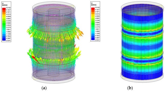 Magnetic field analysis result of the designed tactile device; (a) vector expressions of magnetic intensity at the effective surface in the cross-section, (b) magnitude contour expressions of magnetic intensity at the effective surface in the cross-section.