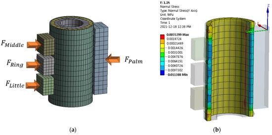 In order to determine the field-dependent stiffness, the structural analysis of MRTGC is undertaken, utilizing the finite element method (FEM). The Ansys Workbench program (Ansys Incorporation, Canonsburg, Pennsylvania, USA) is used for the simulation. To input each human source into the engineering data, all tissues are assumed to be incompressible. Therefore, when entering the elastic modulus, all Poisson ratios are fixed at 0.49. Since the 3D model is not a complex structure, the mesh is created as an automesh as a coarse type. The number of created nodes is 15,479, and the number of elements is 2385. The model used in this work is shown in Figure 10, and , , , and in Equation (1) are applied as shown in Figure 10a. The stiffness is calculated assuming that these forces press the cylinder by 1 mm from both sides of the cylinder. For , all normal forces in which MRPF occurs are calculated based on the direction in which the force is applied (based on the y-axis in the analysis). The normal force generated in the MRPF when the grip is applied is shown in Figure 10b. The values calculated through FEM simulation are presented in Table 2. It is remarked here that in this simulation, the maximum current is limited by 0.35 A, considering safety issues with regard to the gripping status.