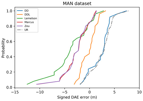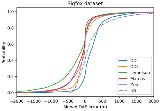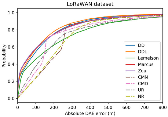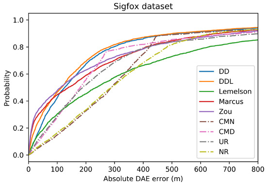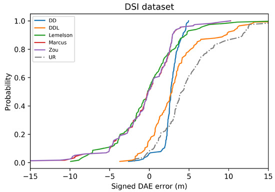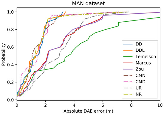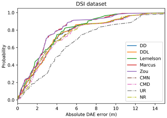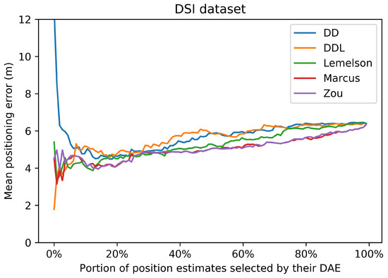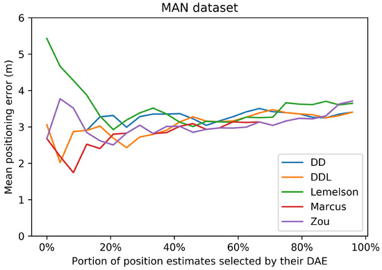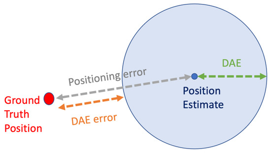 - DAE normal random (): A randomly sampled value from a normal distribution is assigned to characterize the DAE of each estimate. The distribution is centered at the value of the mean positioning error in a previously unseen set, while it is scaled by one quarter of the standard deviation of the positioning error in that set.