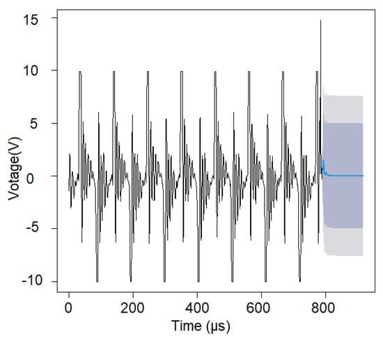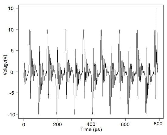 Other researchers focused on eliminating the noise produced in acoustic cavitation [] and explained the apparition of the electrical signal in cavitating liquids using the theory of double layer from the physics of plasma [,]. Differential equations, ARIMA, and artificial neural networks were proposed for characterizing the signal in the time domain [,,,].