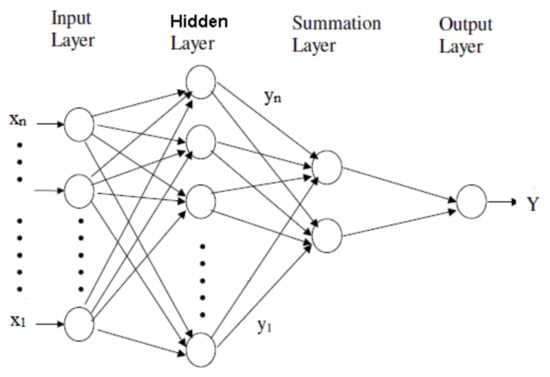 Generalized Regression Neural Network belongs to the group probabilistic neural networks. The GRNN architecture is presented in Figure 3. It contains four layers—Input, Hidden, Summation, and Output []. Given its ability to capture nonlinearities, learning without backpropagation, and the use of nonparametric regression, GRNN was widely utilized for solving classification, regression, and forecast problems that involve continuous variables [,].