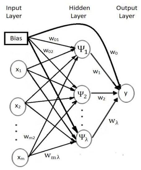 The neurons in the hidden layer apply a kernel function to the distances between the training data and the prediction point. The σ values are used for estimating the influence radius. The best σ should be determined when training the network to control the distributions of the kernel function []. The most used approach for finding the optimum σ is minimizing the mean square error (MSE). This study employed the conjugate gradient algorithm to estimate the best σ for the entire model.