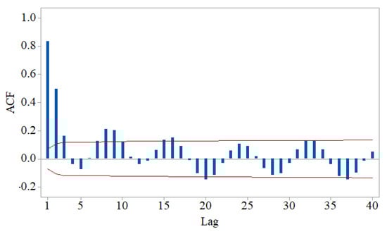 The Shapiro–Wilk and the runs test rejected the normality and randomness hypotheses, respectively. The KPSS and Levene tests did not reject the stationarity and homoskedasticity hypotheses. The autocorrelation function (ACF) chart from Figure 5 confirms the signal’s autocorrelation.