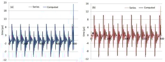 The charts of the recorded and computed values of the signal by using the hybrid algorithms are presented in Figure 9. Comparing Figure 9a,b, one may remark that the Wavelet-ARIMA model generally underestimates the maximum recorded values. The Wavelet-ANN model does not fit the first ten series values well but better fits the rest of the data series.