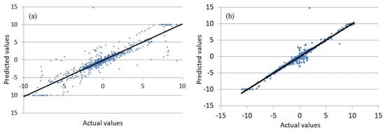 Figure 10 emphasizes the best forecast quality of the Wavelet-ANN model. It contains the chart of the computed values plotted against the recorded values. The points that have the coordinates (actual, predicted) are situated along the first bisectrice of the coordinates axes in both Figure 10a,b. Still, they are more dissipated in Figure 10a, corresponding to the Wavelet-ARIMA model, than in Figure 10b, corresponding to the Wavelet-ANN model.