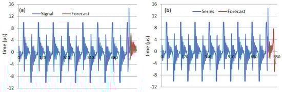 The signal (blue) and the forecast (red) in (a) the Wavelet-ARIMA and (b) Wavelet-ANN model (red).