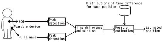 In this paper, we propose a method to estimate the load positions of wearable devices without requiring the user to perform specific actions. The proposed method calculates the time difference between a heartbeat obtained via an electrocardiograph and a pulse wave obtained via a pulse sensor, and it then classifies the sensor position on the basis of the time difference. We assume that the pulse sensor is embedded in a wearable device. When the heart pumps blood to the body, the sinus node, a cluster of cells near the heart’s right atrium, controls constriction of the heart by electrical stimulation. An electrocardiograph measures the electric potential of this stimulation. Currently, small, coin-sized electrocardiographs and a clothing-type electrocardiograph are commercially available. The heart rate and various physical and mental characteristics can be acquired by analyzing ECGs [15,16], and, in the future, it is expected that users will be able to access personal ECG data on demand. In the human circulatory system, blood pumped from the left ventricle through the aorta (main artery) to the whole body passes through the arteries and reaches the capillaries. A pulse wave sensor can measure changes in blood flow. Here, the pulse wave arrival time depends on the distance from the heart, and as a result, the time difference between a heartbeat and a pulse wave measured by a sensor depends on the sensor’s location on the body. Accordingly, the proposed method detects the occurrence time of a heartbeat and the arrival time of a pulse wave, calculates the time difference, and used it to estimate the load position of the wearable device.