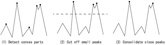 Find all convex parts that satisfy ( x h [ t + 1 ] x h [ t ] ) × ( x h [ t ] x h [ t 1 ] ) 0 . If the same values continue after a peak, i.e., if the top of a peak is flat, the midpoint of the flat interval is detected as a peak;