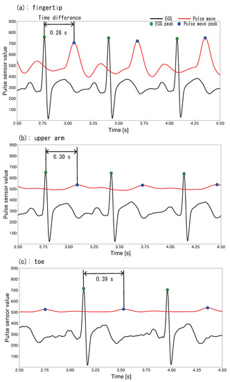 In the evaluation experiment, the pulse and ECG sensors were analog-connected to a single Arduino board; therefore, time synchronization was not required. In a practical application, however, the pulse and ECG sensors would have their own processors, and they would transmit sensor data to a computer to calculate the time differences independently via USB or Bluetooth. In that case, the sensor devices would require synchronization. Once synchronization is ensured, the transmission delay and data processing time do not affect the proposed method, because the devices send sensor data with timestamps when analog values are read. Nevertheless, accurate synchronization of multiple devices remains an ongoing issue. In addition, an oscillator would produce a time gap due to frequency stability. A general oscillator with a ±50 ppm frequency stability (SG-8018CB, Seiko EPSON Corp., https://www5.epsondevice.com/en/products/crystal_oscillator/sg8018cb.html accessed on 29 January 2022) would generate a ±180-ms time gap per hour, which would affect the proposed method. Analog–digital conversion also suffers from jitter, i.e., deviation from the true periodicity of a presumably periodic signal; however, the amount of jitter is much less than a single clock cycle and would not affect the proposed system. Further investigations will be required to explore these issues.