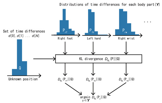 When the frequency of a certain bin is empty, the KL divergence cannot be calculated because P ( i ) or Q ( i ) becomes 0, which causes an undefined log 0 or divide by zero error. To avoid this problem with a general solution, a very small value of 0.0000001 is added to each bin. Finally, the KL divergence between the test and training datasets has been calculated for each body part, the part with the smallest KL divergence is estimated as the load position by the proposed method as follows, where Y denotes the set of positions with attached wearable devices.