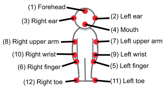 Five subjects (denoted A, B, C, D, and E; four men (A–D), and one woman (E); average age: 23.0 years) participated in our data collection experiment. Pulse wave sensors were attached to 12 body parts, and an ECG sensor with three electrodes was attached near the heart. As shown by the red circles in Figure 5, the 12 target body parts were the (1) forehead, (2) left ear, (3) right ear, (4) mouth, (5) left hand finger, (6) right finger, (7) left upper arm, (8) right upper arm, (9) left wrist, (10) right wrist, (11) left toe, and (12) right toe.