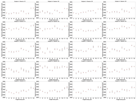 The average and standard deviation of the peak time difference for each body part and each session for the five subjects are shown in Figure 6. The numbers on the horizontal axis correspond to the numbers of the body part positions shown in Figure 5. A • represents an average time difference, with the error bars indicating the standard deviation.