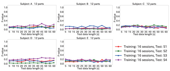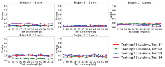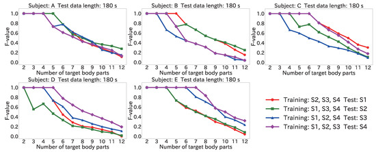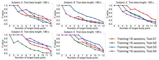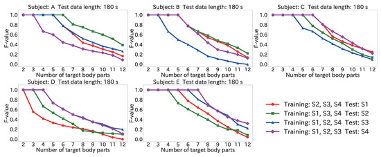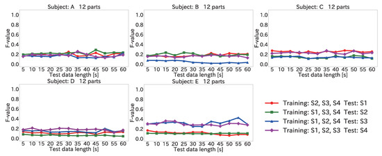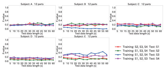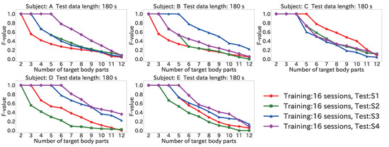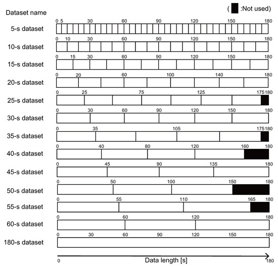 We expected that the proposed method’s performance would be affected by the length of the data for training and testing. To understand this effect, we investigated the performance with the data split in the 13 different ways as illustrated in Figure 7. Here, 12 of the splits were created by splitting the 180 s of data into 5 to 60 s intervals in 5 s increments, and the remaining data were the original 180 s data. For example, the 5 s dataset consisted of 36 pieces of 5 s data, and the 40 s dataset consisted of four pieces of 40 s data, with the extra 20 s of data discarded. Table A2 lists the number of peak time differences calculated for each subject, session, and body part.