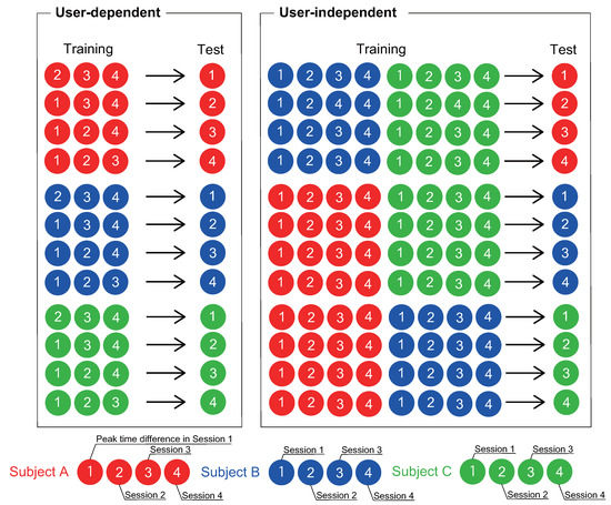 • User-dependent: To estimate the sensor position on the same subject but in a different session, we defined a user-dependent environment in which the training and test data came from different sessions for the same subject;