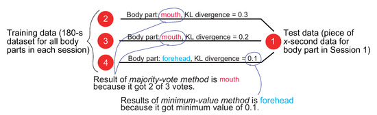Note that part of this work was published at the 23rd International Symposium on Wearable Computers [17]. However, the data collected for the evaluation experiment reported in the conference paper was limited, with only one minute of data for each body part in an experimental session. Moreover, only a simple evaluation was conducted, with a session-dependent environment. Hence, for this paper, the evaluation experiment was repeated with data collection for 3 min at each body part in each session, and with two evaluation environments, which were user-dependent (i.e., session-independent) and user-independent. These environments were designed to reflect the actual use of the proposed method. As a result, this paper has been substantially revised from the conference paper [17].
