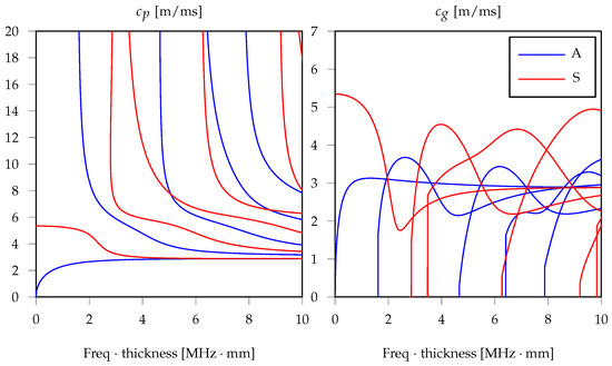 The number and type of the generated modes vary with the frequency and shape of the actuation. In general, it is possible to design the actuation in time and space to limit the effect of multi-modality and dispersion in order to reduce the complexity of the generated/received signals. In more detail, Figure 1 shows the dispersion curves [12] in terms of phase (left panel) and group (right panel) velocity of the Lamb waves existing in an aluminum plate of infinite extension and 1 mm thickness.