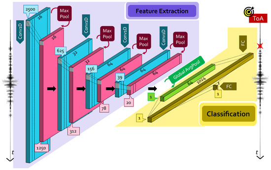 The first CNN architecture considered in this work is schematically represented in Figure 2 and is devised for ToA retrieval from 5000-long time series. As can be seen, five (,,10,2) Conv1D layers ( being the layer index), with and ReLU activation function, are stacked in cascade and followed by a MaxPool layer with a compression factor equal to 2. A global average pooling layer (Global AvgPool) is also included at the end of the convolutional block to force the regressor behavior of the network: Global AvgPool yields one single feature map out of the 250 different representations at the end of the last AvgPool layer. This single map is then passed to a first FC layer having 1024 neurons activated by ReLU; ToA can finally be retrieved from the output layer consisting of a FC layer with one neuron and linear activation. It is worth saying that the so-far designed CNN model is characterized by 1,259,299 parameters, requiring a minimum memory space of at least MB even in quantized form: the Adam optimizer [25] with learning rate of 0.001 and loss weight equal to 1 was used for training such parameters, and the model was trained for 15 epochs.