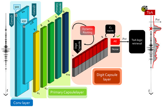 Conversely, ML solutions can inherently handle all these sources of complexities in a very efficient and user-transparent way. For this reason, a second NN block is stacked in cascade to CapsNet to retrieve ToA from the output probability history yielded at the end of the capsule processing. It is worth observing that, in ToA terms, the problem is exactly analogous to the one faced to estimate ToA via CNN while working directly with time series data. The main difference is that, for this second scenario driven by CapsNet, probability functions are available as inputs. Coherently, in the approach presented in this work and which is novel with respect to the one in [27], it is suggested to employ the same small CNN as “ToA logical retrieval” block (see Figure 4) in a completely agnostic and general purpose manner.
