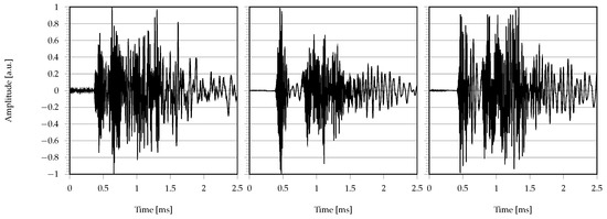 A total amount of = 60,000 signals was generated via exhaustive combination of all the possible configurations between the propagation distance, noise level and pre-trigger window: 80% of them were used for training, 10% for validation, and the remaining 10% for testing. Each time series was then normalized and mean removed. Some exemplary signals collected at the end of the dataset generation phase are plotted in Figure 5.