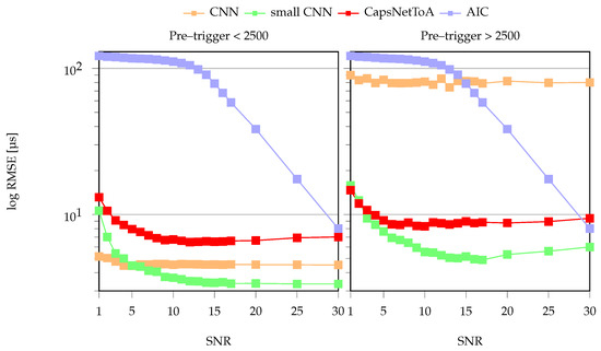 The ToA estimation results for test data with a pre-trigger window below 2500 (i.e., the one used for training) are displayed in the left panel of Figure 6: they are given in terms of RMSE (log scale) for increasing SNR. From this figure, two different trends in the reported errors are evident. Firstly, the error profile of AIC is inversely proportional to the hidden noise level affecting the signal; moreover, it is characterized by a slowly decaying trend with a smoother profile. The performance results of the four approaches are in the same order of magnitude only for SNR equal to 30 dB, i.e., when, as discussed before, the signal statistics are well defined and easy to be identified, even via conventional processing tools.