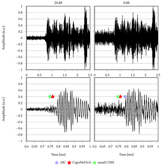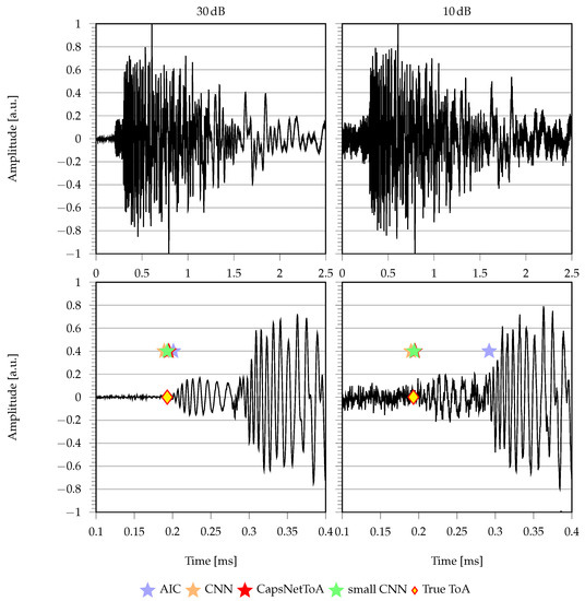 A graphical depiction of the output collected from the different approaches is displayed in Figure 7, which shows a zoom in the 0.1–0.4 ms window with drawn star markers indicating the predictions obtained from AIC (blue), CNN (orange), CapsNetToA (red) and small CNN (green), superimposed to the true label (yellow diamond). As can be observed, the estimates are considerably accurate in the left panel (SNR = 30 dB) for all the methods, while AIC completely fails in the case of important noise levels (same signal, but SNR = 10 dB) depicted in the right-hand side.
